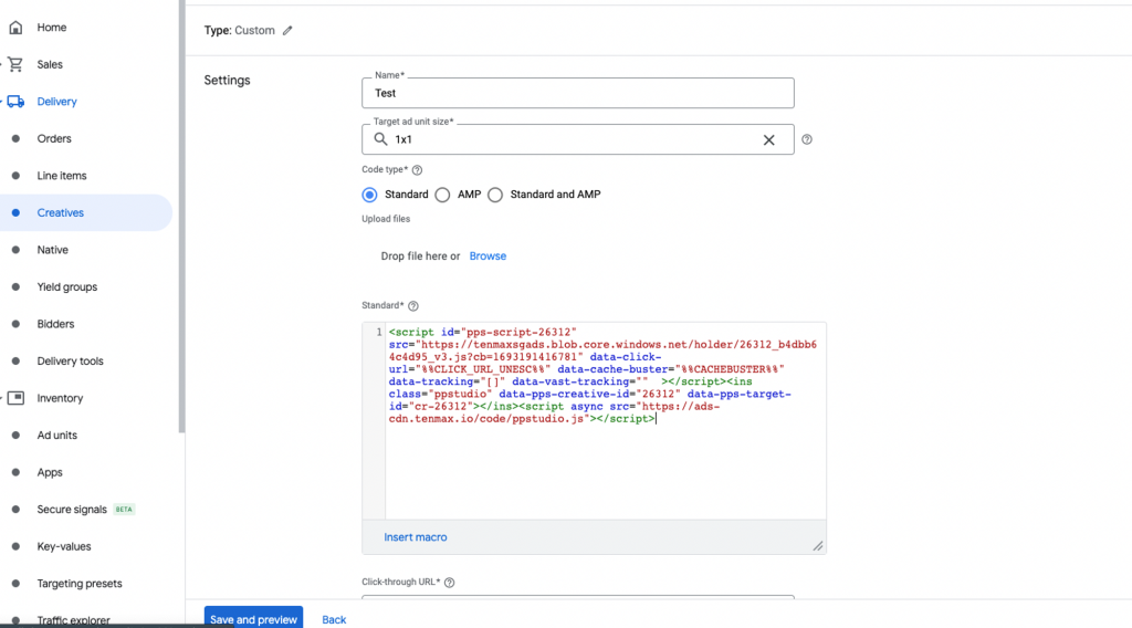 • Choose【Standard】for Code type. If using GAM : AMP tag(iFrame), please select 【AMP】, and paste the AdNeon Ad Tag in the corresponding field below.