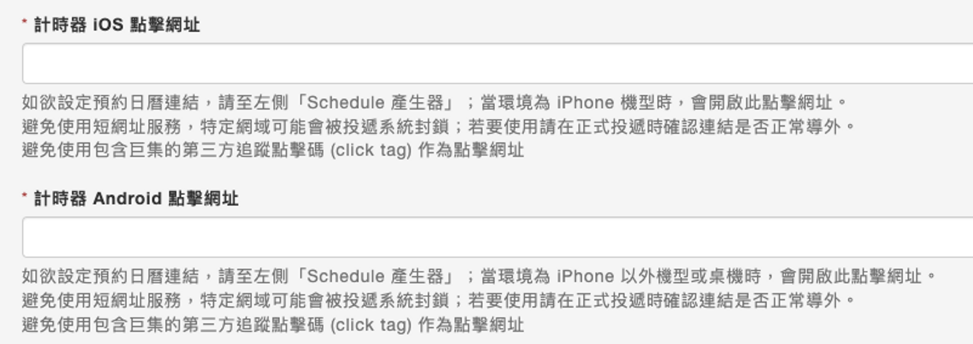 此版型的計時器可針對不同作業系統設定不同的點擊網址,跟一般的點擊網址一樣,可以設定一般導外連結也可以藉由新功能「Schedule 產生器」生成不同作業系統的預約行事曆連結。