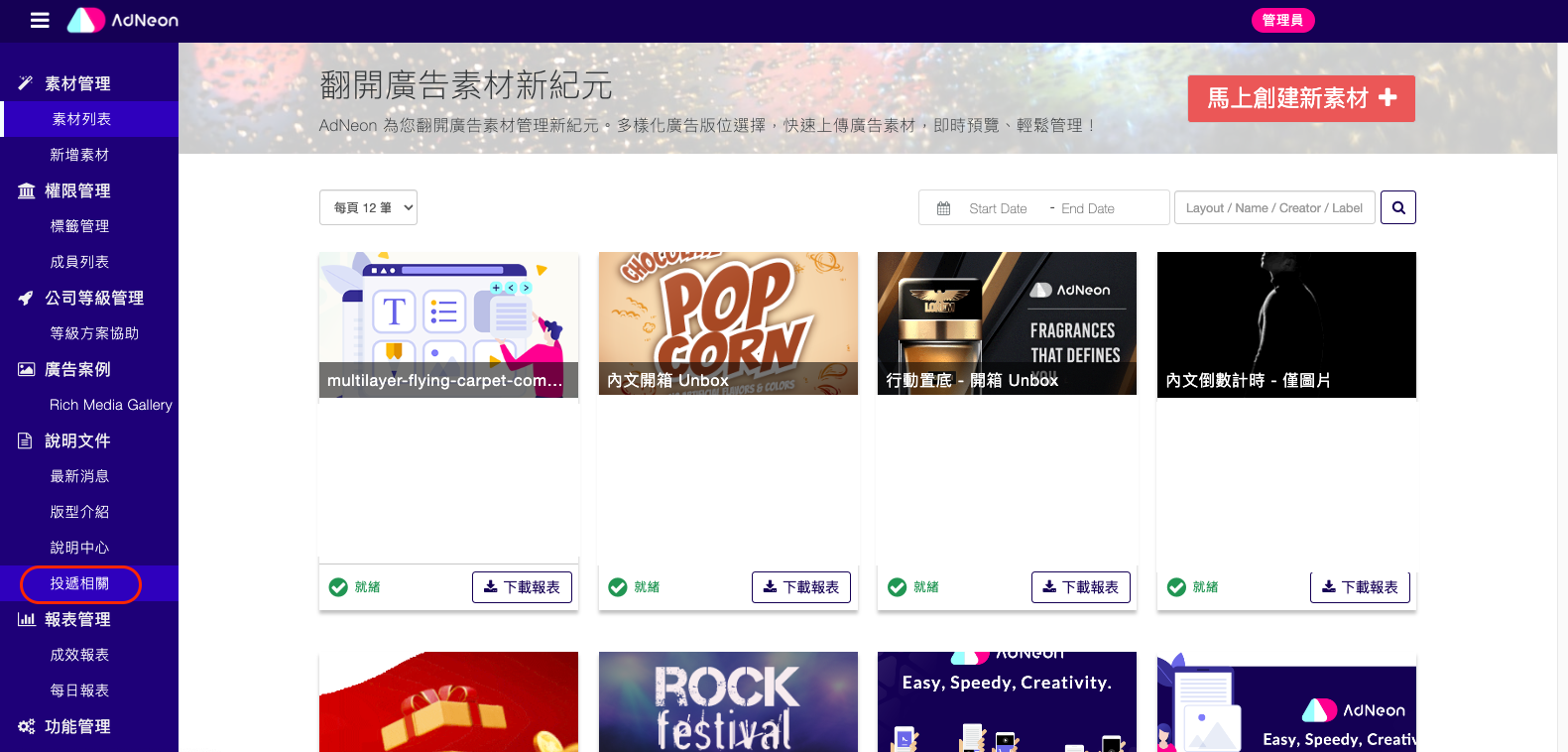 而在「新建素材」的步驟 3. 以及「素材小卡」上,則會呈現上傳的素材檔案大小 + AdNeon 的 JS 檔案大小喔!