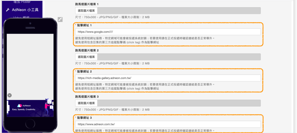 AdNeon 在台灣時間 111 年 11 月 2 日(星期三)後取消支援於 Ad Tag 第二步以 URL 形式進行廣告點擊追蹤;如果要使用 URL 做點擊追蹤,請直接於建立素材內的點擊網址設定。